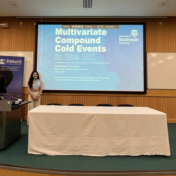 My research is focused on multivariate compound cold events (MCCE) in the United Kingdom. My work so far has looked at characterising MCCE in the UK into cold-dry and cold-wet events and seeks to identify the drivers behind these events by using weather patterns. My current work looks at the impact of MCCE on the rail sector in Scotland, and in future will explore how the findings can be used in impact-based forecasting systems.