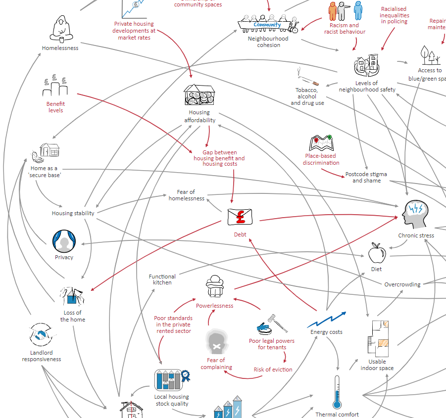- Systems mapping is more than a technical tool - it can be a way to bring different perspectives into dialogue and reveal blind spots. To try to help with this, we followed up the work in this paper by developing a protype of a new kind of systems mapping software, which layers lived experiences on top of more traditional evidence about housing and health.