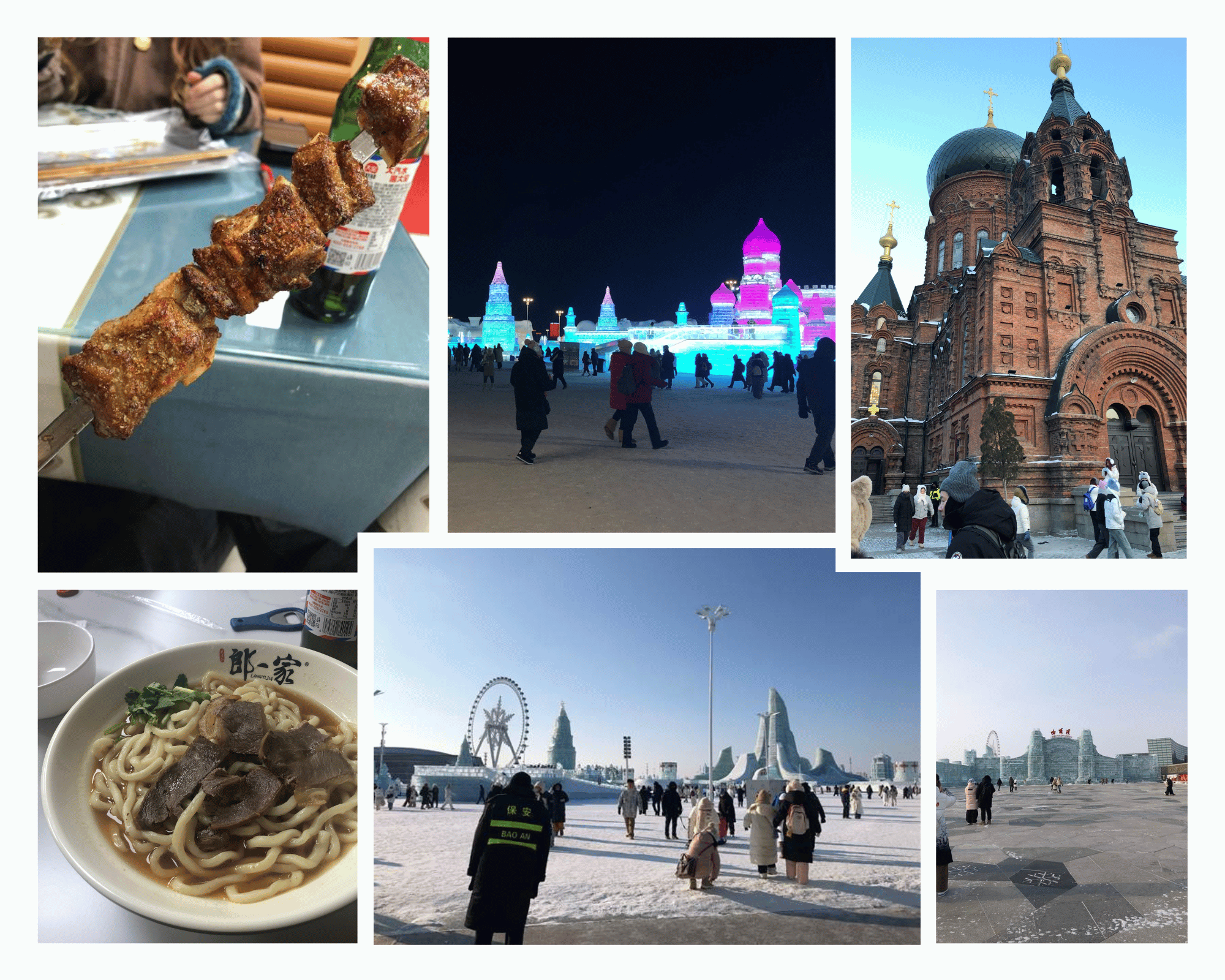 The next and final day we spent exploring the city and doing little things. We ate at a 东北 (Dongbei, north east, north eastern) restaurant, visited the cathedral, went to a fayre kind of thing on top of the frozen river (where we got swung around on an inflatable seat attached to a Jeep) and finished the day by visiting one of my fav kinds of Chinese restaurant — these small little restaurants that usually have similar menus, often featuring fried rice, noodles and meat in broth, dumplings and then some more particular dishes.