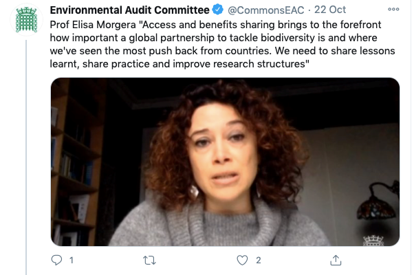 Prof Elisa Morgera (University of Strathclyde), was invited to give oral evidence to the UK House of Commons Environmental Audit Committee on 22 October 2020 as part of an inquiry into the pressing need to address biodiversity loss and the ongoing international on a post-2020 global biodiversity framework (see terms of reference for the inquiry here .)