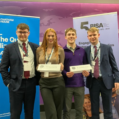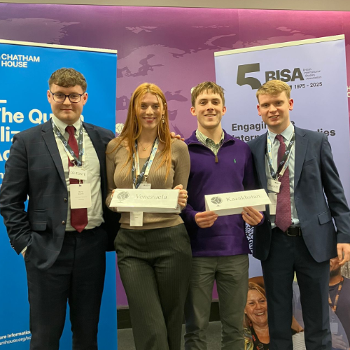 Earlier in December, four Honours students – Harry Clarke, Megan Young, Robert Johnston, and Andrew Sillars (pictured below) – also attended a climate negotiation simulation at Chatham House in London. Representing Venezuela and Kazakhstan, the students explored international diplomacy in practice while developing their negotiation and policy skills.