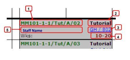 For activities where the staff or room changes from week to week a variant may be used. This is denoted by the inclusion of week numbers after the activity name in brackets.